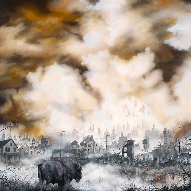 So it's no wonder that I'm loving the haunting paintings of Brian Mashburn. Witness, his new show of works, is on display at the Thinkspace Gallery in Culver City. Eerie and provocative, solitary wildlife (and the occasional child) prowl charred landscapes witnessing the detritus of industrial cities run riot.